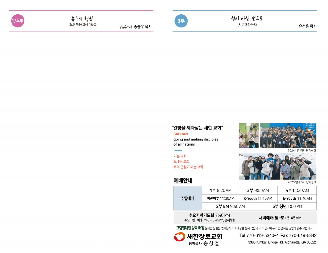 송슬기가정의학과 독감예방 백신 무료접종: 독감철을 맞아 독감예방 백신 무료접종을 해드립니다. 보험이 없는 주일학교학생들과 중고등부 학생들, 청년과 시니어들에게 우선 적으로 제공하고자 하오니 희망 하시는 분들은 전달 될 링크를 통해 신청해 주시기 바랍니다. ○ 일시:10/26(오늘) 3부 예배 후 ○ 장소: 208호 ○ 문의: 김기희 집사(678-697-6622)